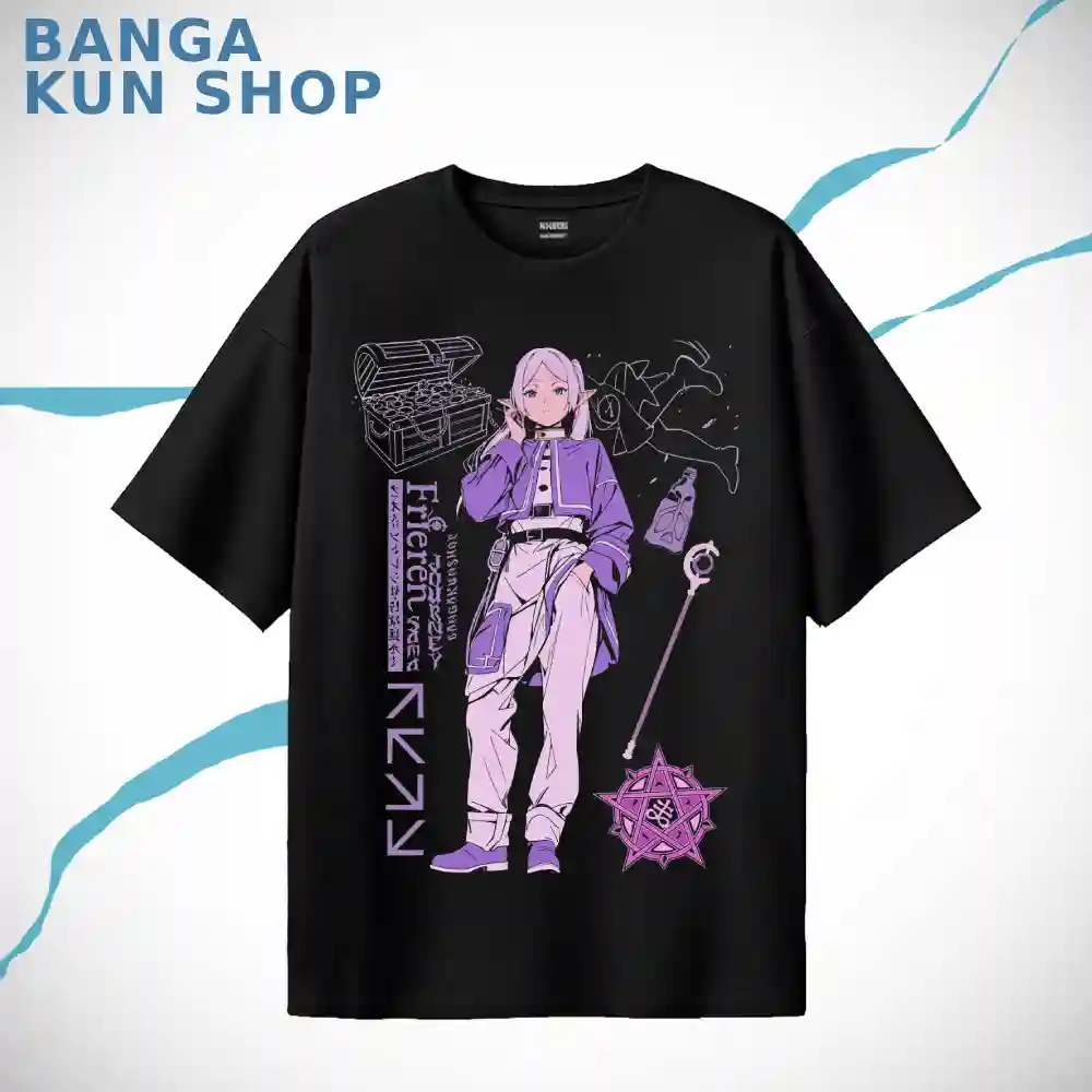 - Design: The T-shirt showcases Frieren Anime TSHIRT STREETWEAR by Banga Kun Shop Drops shoulder Premium Black T-shirt – Frieren: Beyond Journey’s End
